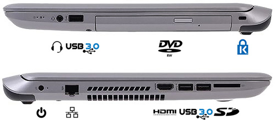 جالب است که با وجود بالا رده بودن دستگاه، این لپتاپ از داشتن پورتهایی نظیر eSATA، Display Port، Thunderbolt و حتی VGA محروم است. شاید یکی از سیاستهای HP این بوده تا برای خروجیهای تصویر، کاربران بیشتر از پورتهای HDMI و تکنولوژیهای بیسیم مانند Intel’s Wireless Display استفاده کنند. بر لبه سمت چپ، سوکت ورودی برق دستگاه در کنار پورت شبکه گیگابیتی Ethernet که ماهرانه طراحی شده است، قرار دارد. خروجی هوای گرم سیستم خنک کننده دستگاه نیز در کنار پورت HDMI روی همین لبه تعبیه شده است. دو پورت USB 3.0 در کنار کارتخوان دستگاه نیز در این قسمت دستگاه قرار گرفته اند. لبه سمت راست میزبان قفل ضد سرقت Kensington، درایو نوری، یک پورت USB 3.0 دیگر و جک 3.5 میلی متری صدا است. در لبه عقبی و جلویی دستگاه هیچ گونه پورت یا اتصالی وجود ندارد. برای ارتباط بیسیم HP به درستی از چیپ شبکه بیسیم Intel Dual Band Wireless-AC 3160 استفاده کرده است که این چیپ از فرکانسهای پایین تا Wi-Fi گیگابیتی با استاندارد 802.11 ac را پشتیبانی میکند. همچنین این چیپ دارای نسل چهارم بلوتوث نیز هست.